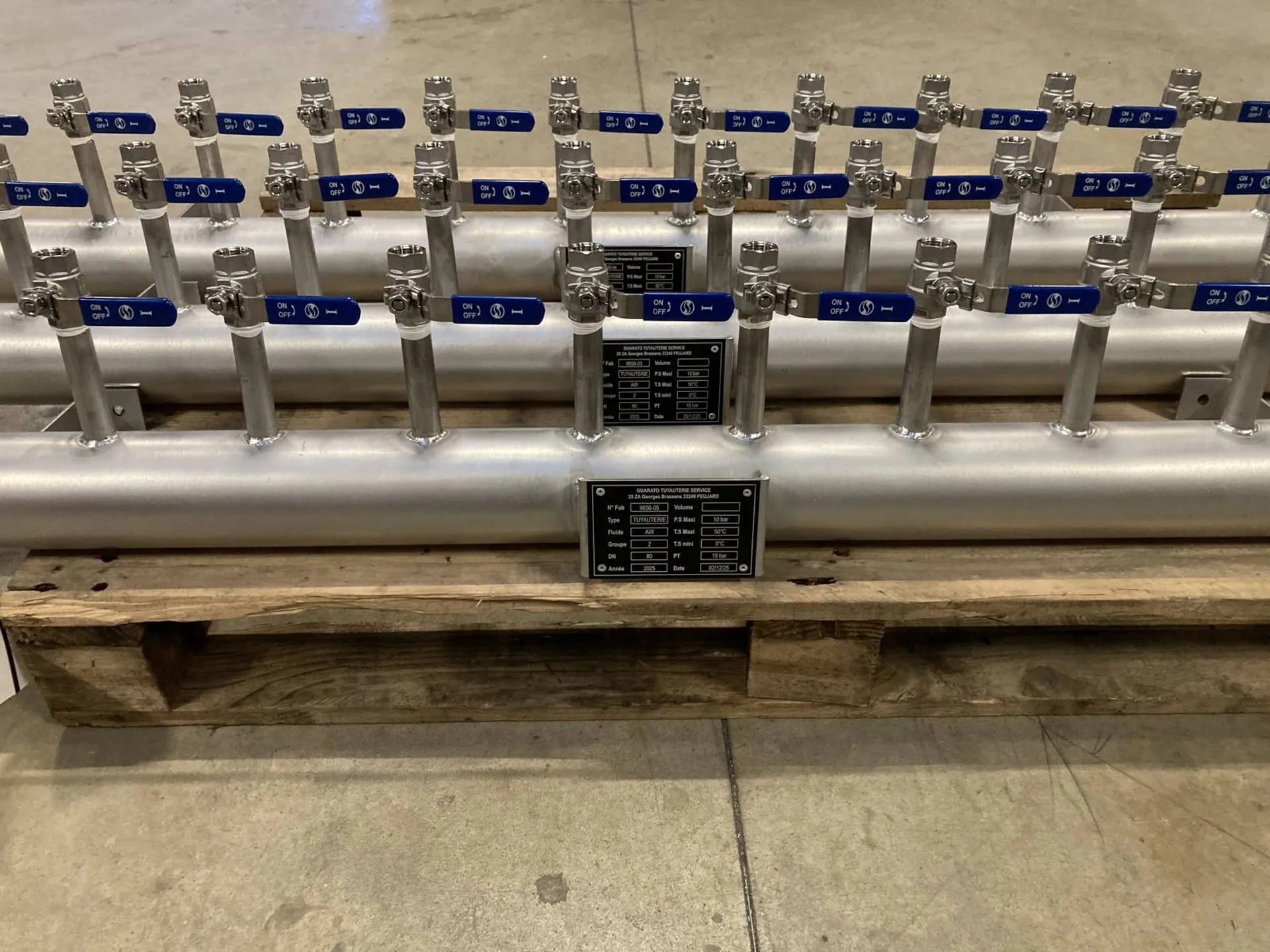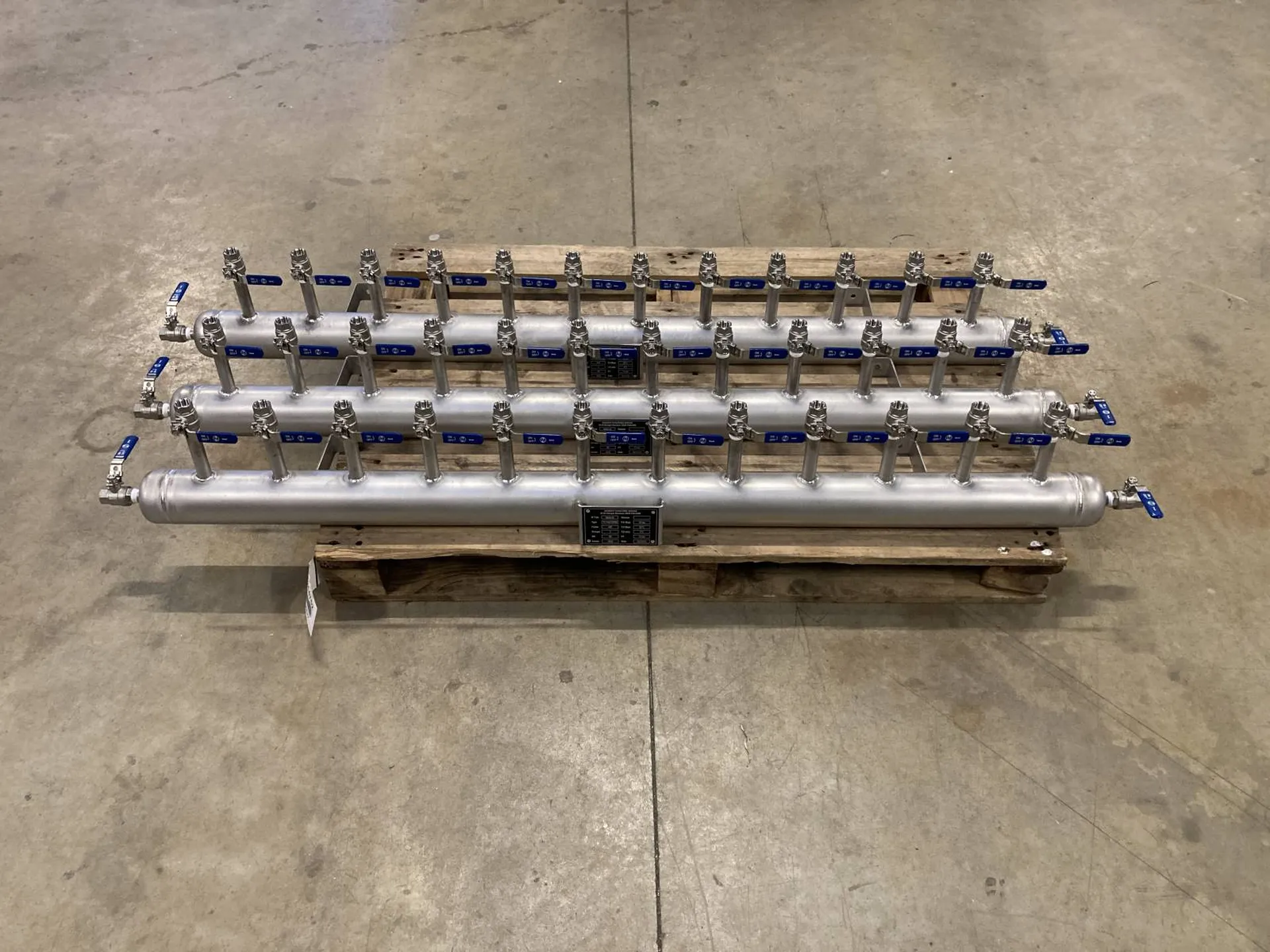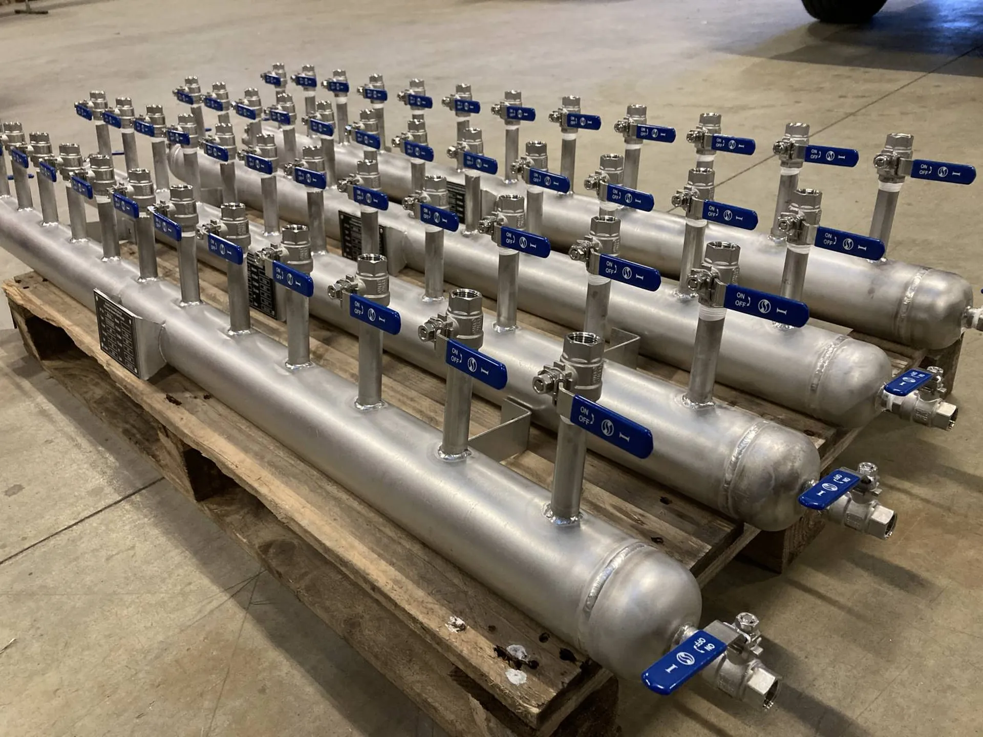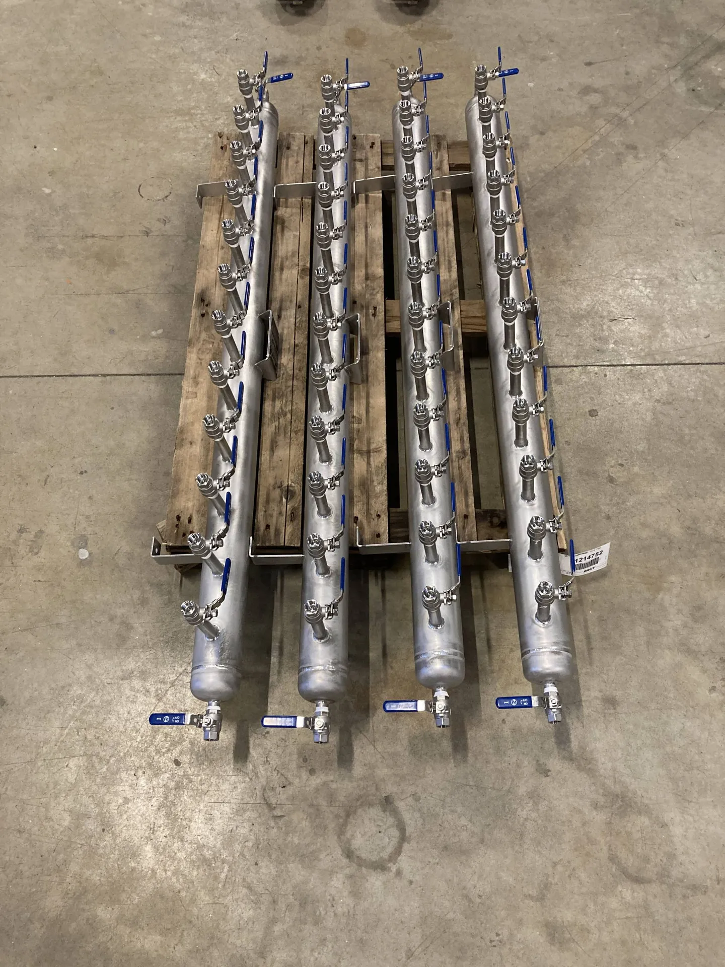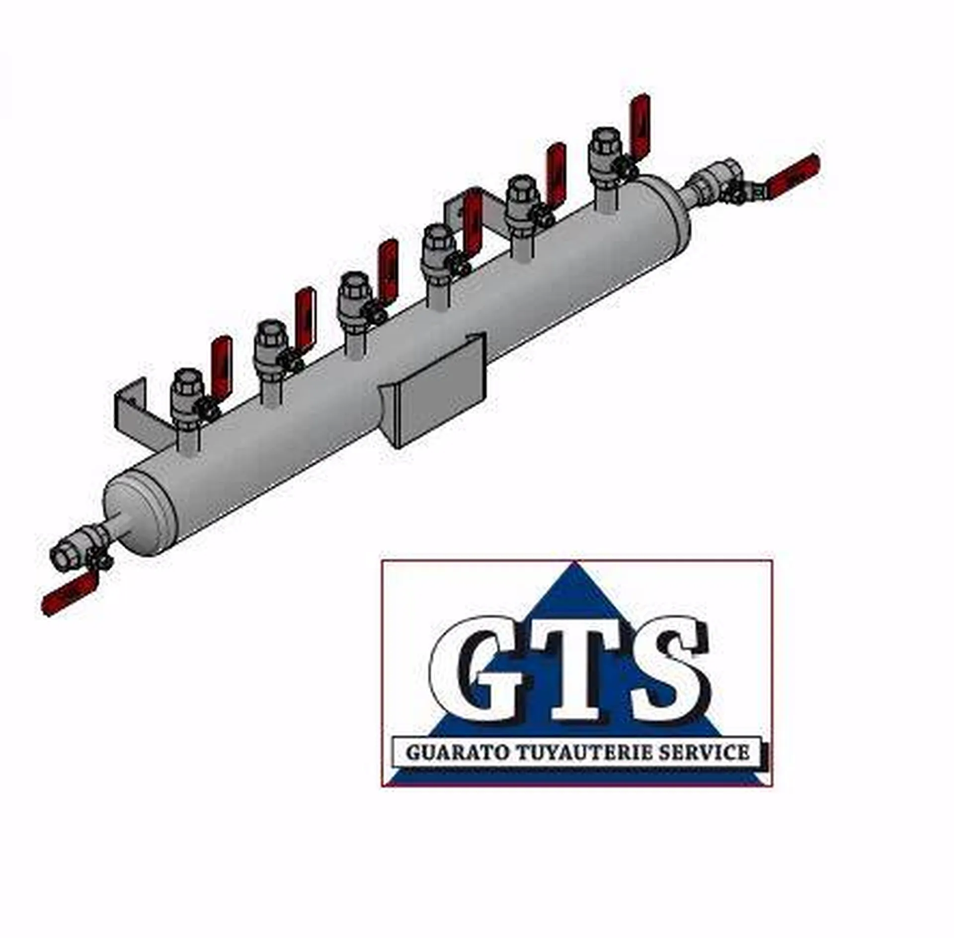 Les clarinettes ont été entièrement fabriquées dans nos ateliers à Peujard, permettant un contrôle qualité rigoureux à chaque étape. Les collecteurs sont équipés de multiples vannes à bille bleues et montés sur des supports soudés robustes. L'ensemble est livré sur palettes bois pour faciliter la manutention.