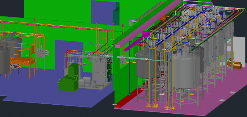 Nous avons fait prêt de 50 scans sur site pour traiter ensuite les nuages de points et modéliser nos tuyauteries, après avoir positionné l'intégralité des équipements fourni par notre client Pierre Guérin (cuves, tableaux de pontage, etc...).