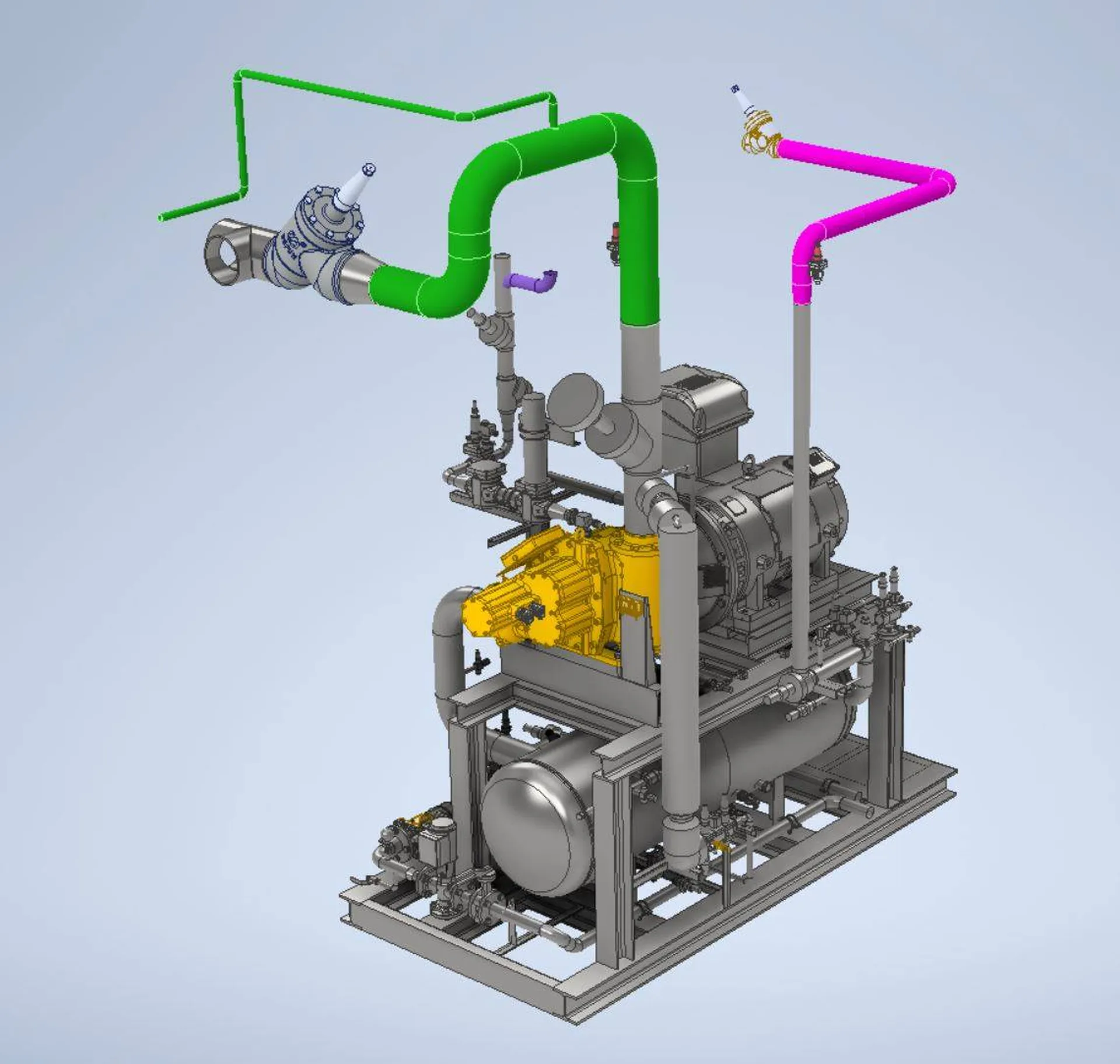 Nous avons utilisé notre scanner laser Faro à très haute performances. Cela nous a permis d'avoir un relevé du local dans lequel le compresseur devait prendre place, précis au mm. Nous avons ensuite créé une maquette en 3D des réseaux de tuyauterie de NH3, HP, MP, BP et soupapes, ainsi que le réseau Glycol de refroidissement de l'huile du compresseur. Ce réseau concoure à la récupération de chaleur de cet entrepôt du Lot et Garonne.