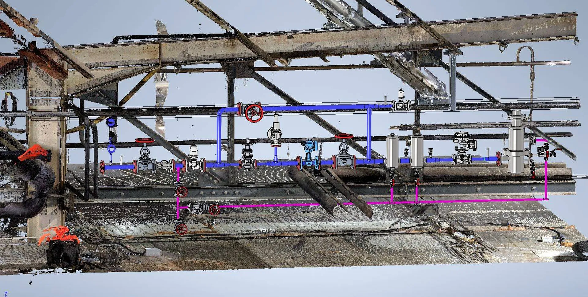 L'objectif est de pouvoir mettre en place un skid vapeur avec un arrêt de production très court. Nous avons dessiné le skid en 3D grâce à notre logiciel de CAO et nous l'avons intégré dans le nuage des points, qui modélise l'environnement réel dans les combles.