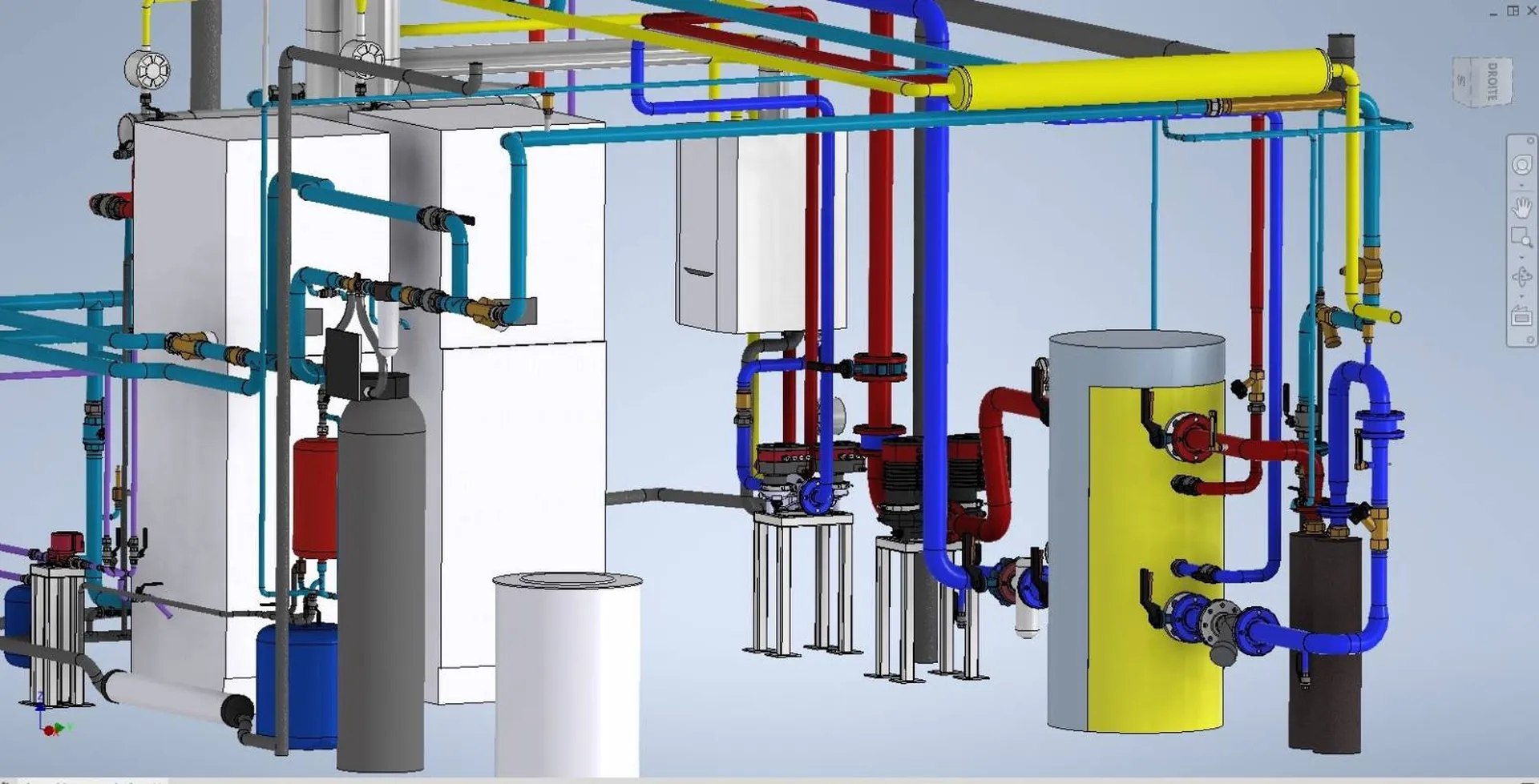 A l'aide du plan de principe et du scan laser qui permet de reconstruire le local avec précision, il s'agit alors de créer en 3 dimensions les réseaux de fluides les uns après les autres : chauffage, refroidissement, gaz, eau froide, eau chaude sanitaire, condensats.Au fur et à mesure de sa conception, le plan est soumis au client afin de recueillir ses remarques en avance de phase. Cela garantit sa satisfaction et augmente les chances de respecter les délais.