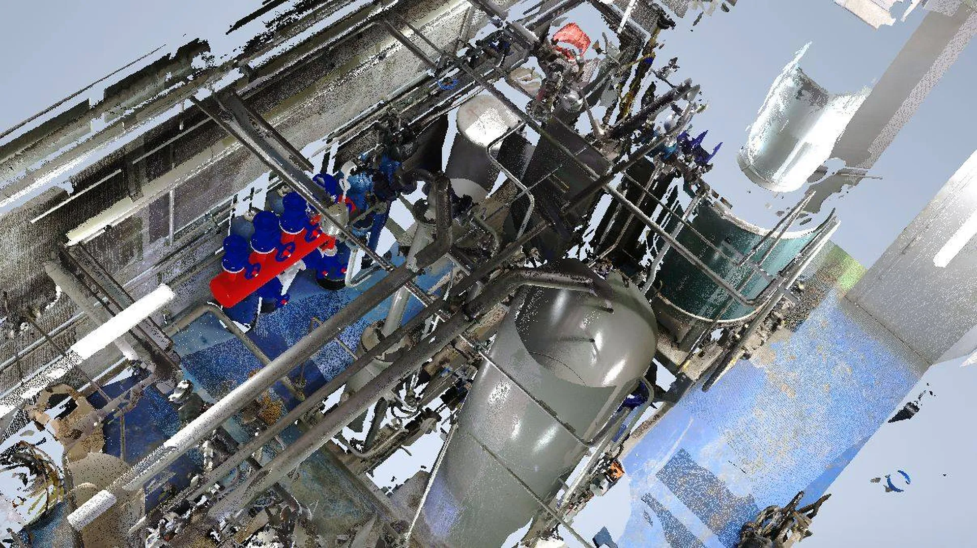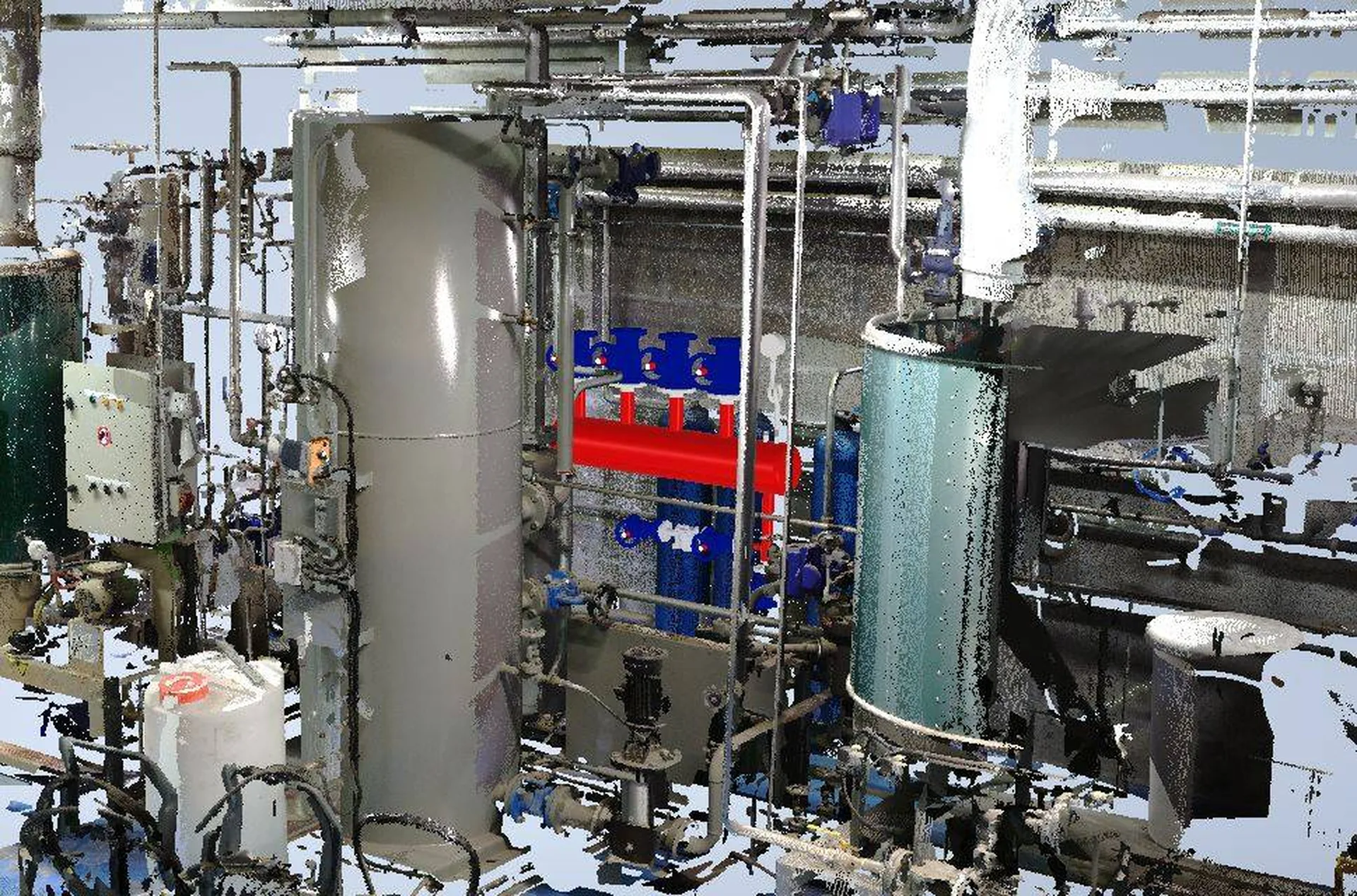 Dans un premier temps, GTS a réalisé un relevé laser chez le client en aquitaine pour numériser la chaufferie vapeur. Cela nous a permis d'implanter le modèle CAO de la nourrice vapeur virtuellement dans le local technique.