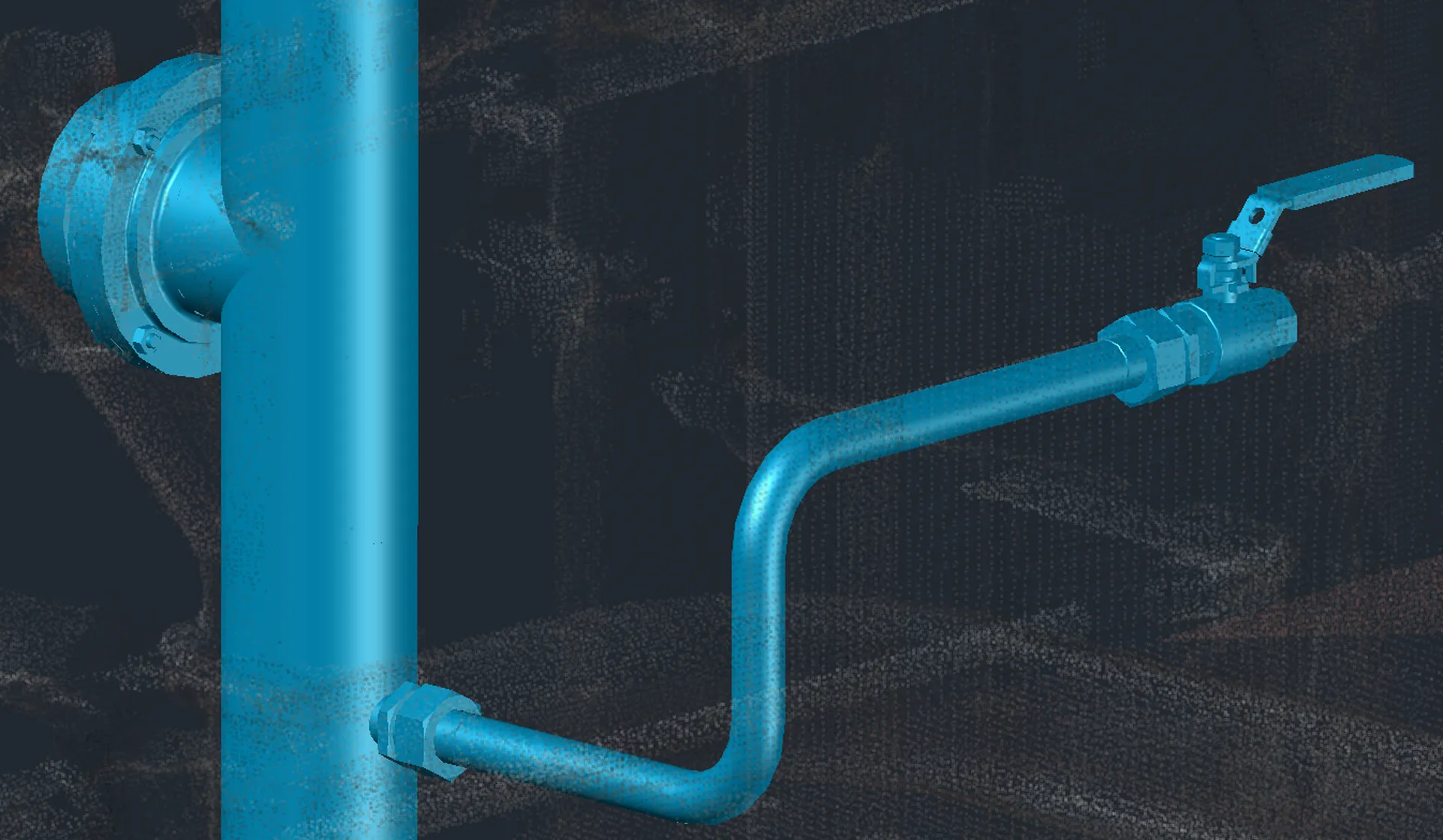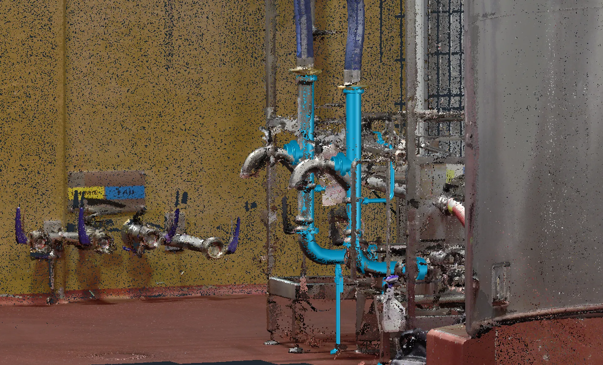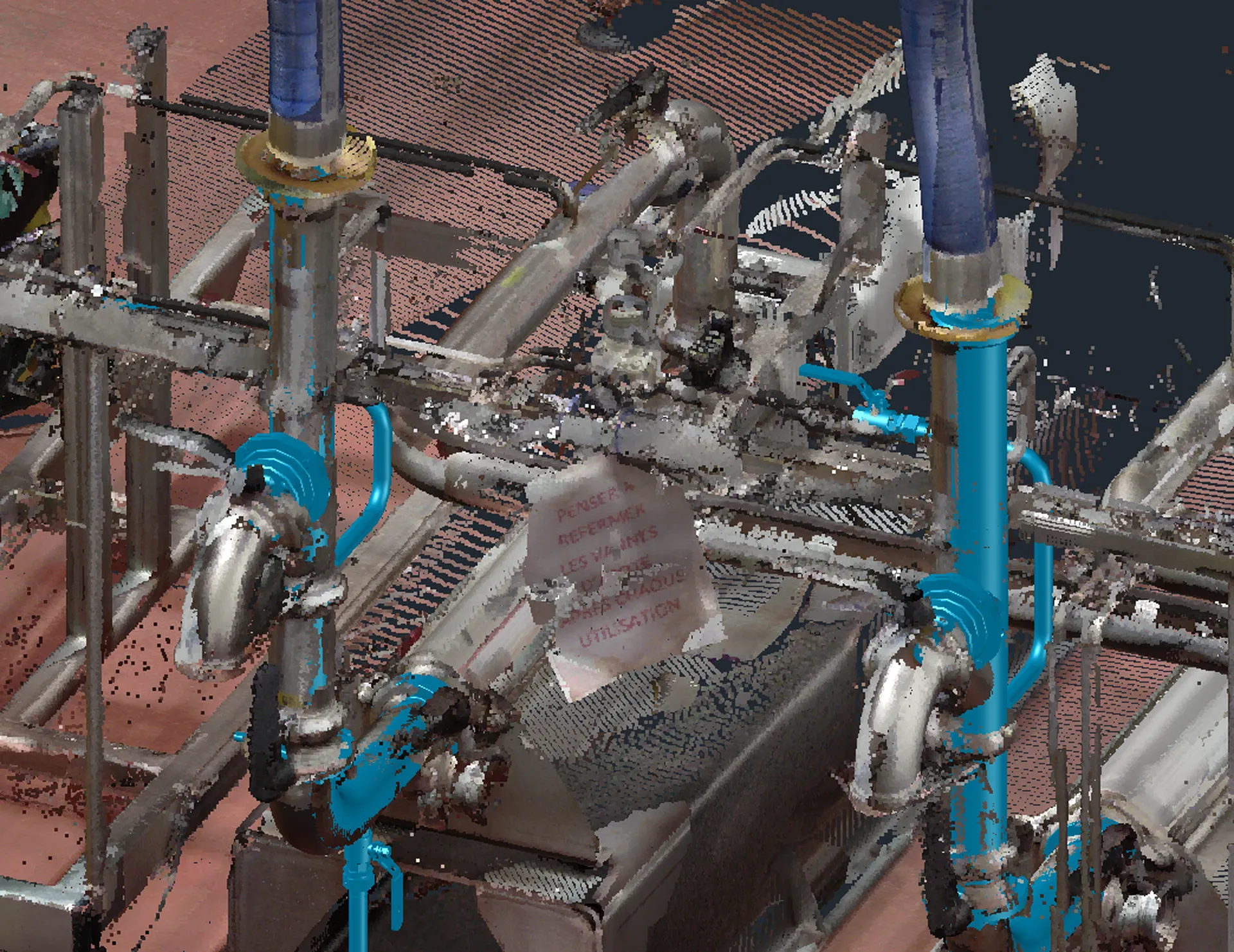 Pour cela, on a utilisé notre laser scanner 3D Faro comme sur de nombreux chantiers et on a dessiné en 3D les 2 tuyauteries dans le nuage de points pour pouvoir préfabriquer ces tuyauteries à l'atelier.