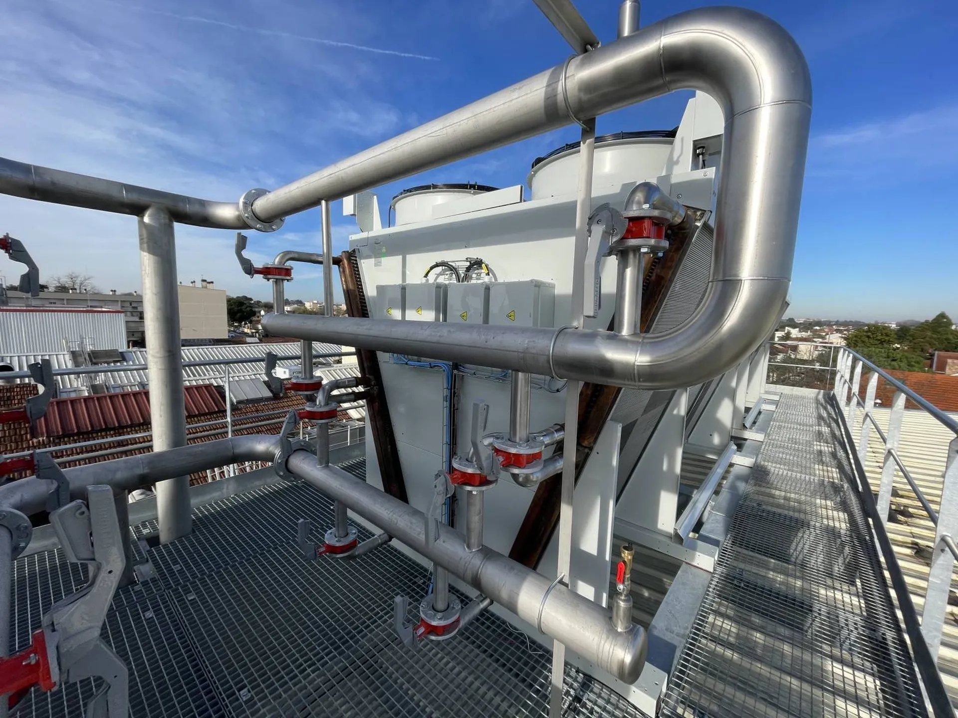 Ainsi, notre client direct, Dalkia Froid Solutions, a opté pour la réalisation d'une boucle de Tichelmann pour raccorder les deux condenseurs en toiture de la Biscuiterie de Pessac. Ces condenseurs servent à évacuer le trop-plein de chaleur créé par le nouveau groupe froid dont nous parlerons dans un futur article.