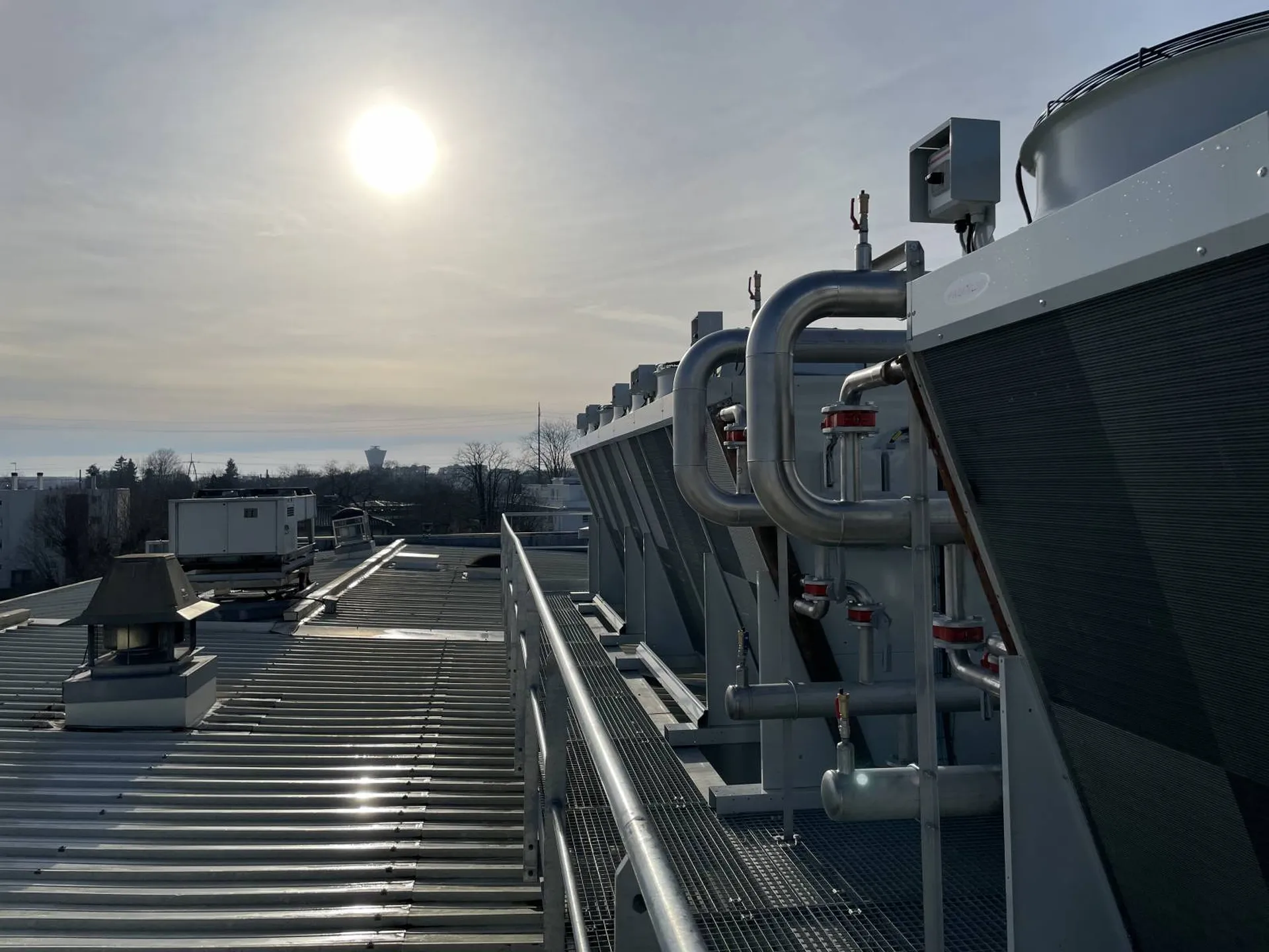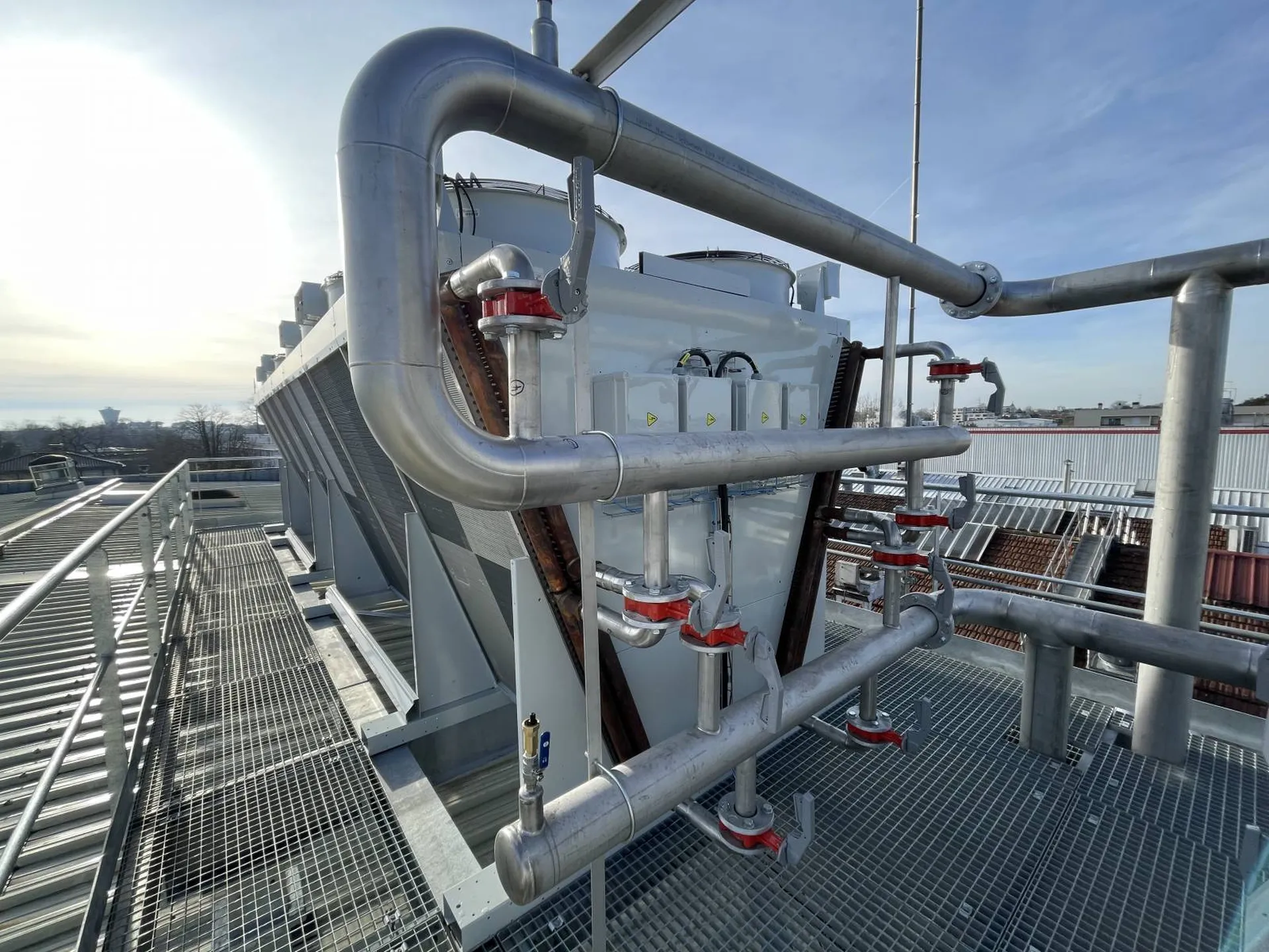 Il nous a également fallu étudier le cheminement exact de nos tubes pour pouvoir les raccorder aux deux groupes en créant la fameuse boucle de Tichelmann. Un autre défi qui ne concernait pas seulement GTS, était de laisser de la place sur la plateforme des condenseurs pour un accès maintenance. Les électriciens aussi avaient besoin de place pour installer le matériel et les câbles nécessaires à l'alimentation électrique des condenseurs.