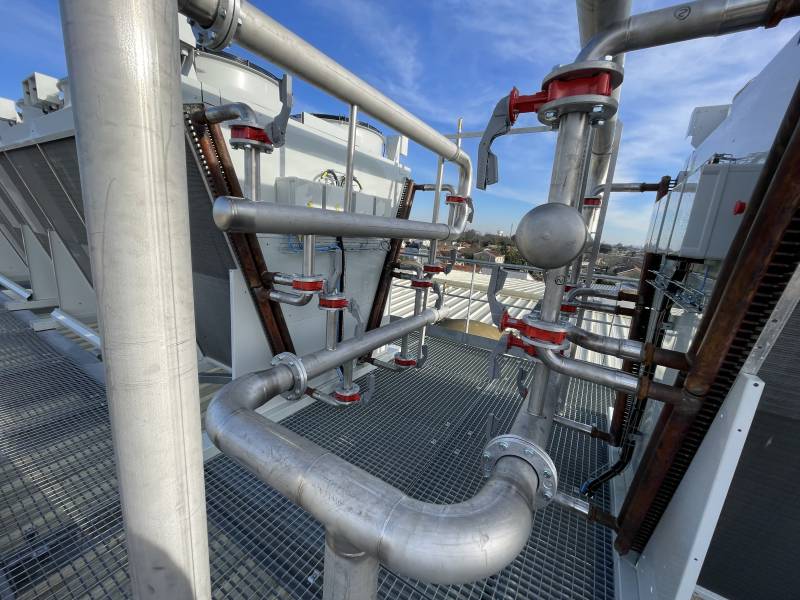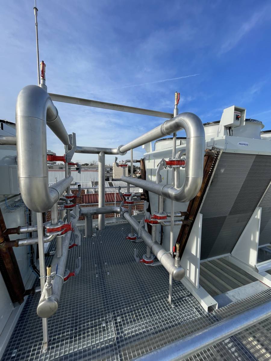 Ainsi, notre client direct, Dalkia Froid Solutions, a opté pour la réalisation d'une boucle de Tichelmann pour raccorder les deux condenseurs en toiture de la Biscuiterie de Pessac. Ces condenseurs servent à évacuer le trop-plein de chaleur créé par le nouveau groupe froid dont nous parlerons dans un futur article.